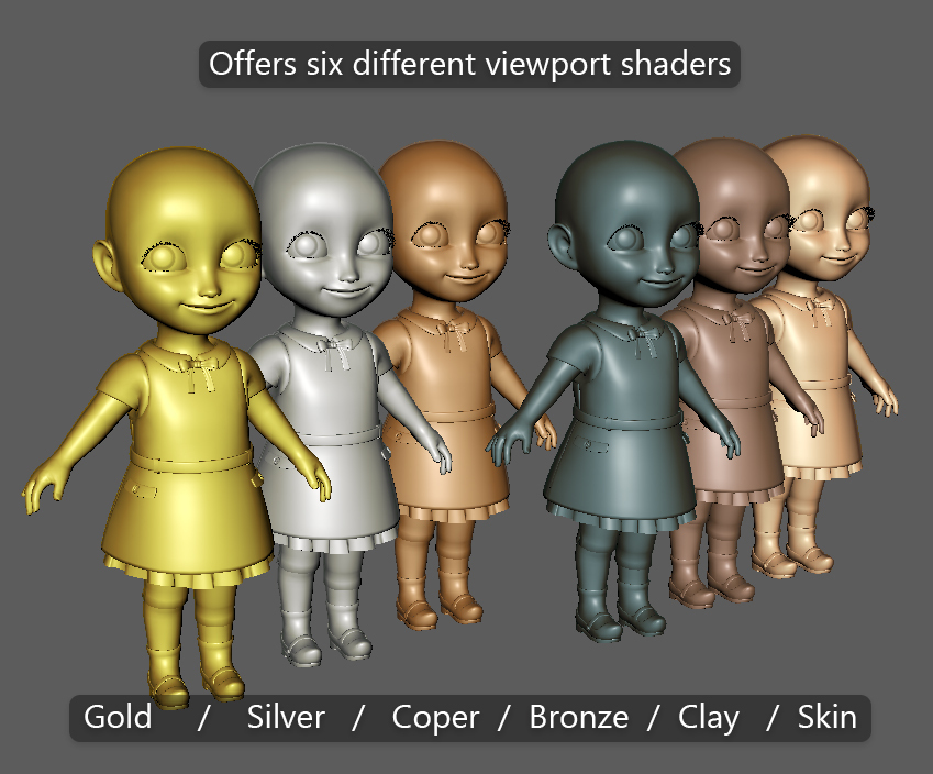 - Offers gold, silver, coper, bronze, clay and skin shader